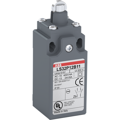 LS32P12B11 is a 30 mm wide, standard Limit Switch made of fiber-glass reinforced UL-V0 material, with 2 mounting holes at the top, 1 ISO M16x1.5 cable entry on the bottom, steel roller plunger actuator and 1 N.O + 1 N.C snap action (Zb type) contacts