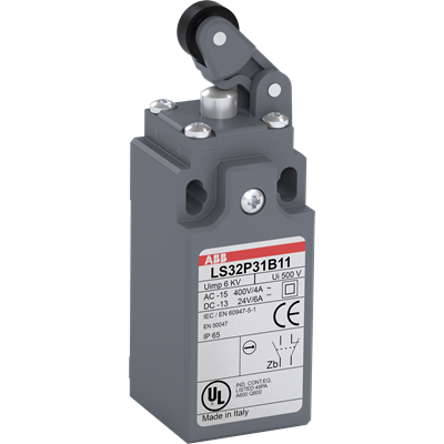 LS32P31B11 is a 30 mm wide, standard Limit Switch made of fiber-glass reinforced UL-V0 material, with 2 mounting holes at the top, 1 ISO M16x1.5 cable entry on the bottom, plastic roller lever (Ø12,5 mm) on steel plunger actuator for horizontal movement and 1 N.O + 1 N.C snap action (Zb type) contacts