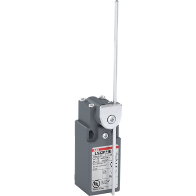 LS32P71B11 is a 30 mm wide, standard Limit Switch made of fiber-glass reinforced UL-V0 material, with 2 mounting holes at the top, 1 ISO M16x1.5 cable entry on the bottom, adjustable stainless steel rod lever (Ø3 mm) actuator and 1 N.O + 1 N.C snap action (Zb type) contacts
