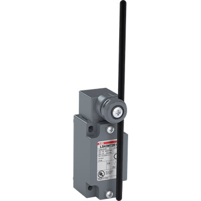 LS43M72B11 is a 40 mm wide, standard reinforced Limit Switch made of zinc alloy material (Zamak), with 4 mounting holes at the top and bottom, 1 ISO M20x1.5 cable entry on the bottom, adjustable fiberglass rod lever (Ø3 mm) actuator and 1 N.O + 1 N.C snap action (Zb type) contacts