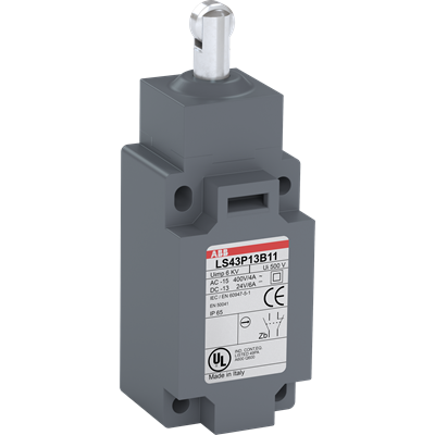 LS43P13B11 is a 40 mm wide, standard reinforced Limit Switch made of fiber-glass reinforced UL-V0 material, with 4 mounting holes at the top and bottom, 1 ISO M20x1.5 cable entry on the bottom, steel roller plunger actuator and 1 N.O + 1 N.C snap action (Zb type) contacts