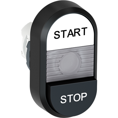 The MPD8-11C Double Pushbutton is: Momentary - Flush/Flush - White/Black Actuator, Clear Indicator - Illuminated - Black Plastic - No contact block - Black - Black - STOP - START